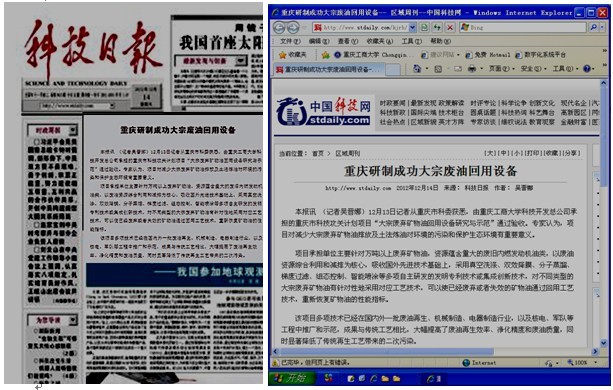 《科技日报》2012年12月14日,以题为“重庆研制成功大宗废油回用设备”,报道了我校的最新科技成果:“本报讯(记者吴晋娜)12月13日,记者从重庆市科委获悉,由yl23455永利集团承担的重庆市科技攻关计划项目“大宗废弃矿物油回用设备研究与示范”通过验收。专家认为,项目对减少大宗废弃矿物油排放及土法炼油对环境的污染和保护生态环境有重要意义。”