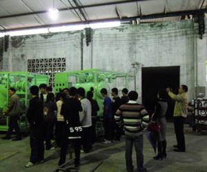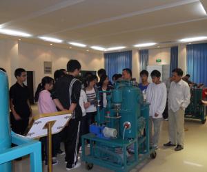 刘林老师以PPT课件的形式,通过内容详实的案例向同学们介绍了公司及废油中心的发展历程,当介绍到科技开发公司从1.3万元起步发展到成为行业领军企业、其技术产品屡屡获奖、在国内外军工民品中都发挥着重要作用时,师生们佩服不已;随后,师生们参观了产品陈列室和生产车间,刘林老师深入浅出地为同学们讲解了滤油机工作原理和生产流程,工人师傅为同学们现场演示了滤油机工作过程。参观过程中,同学们不时地提问,对中心的科技成果表示出浓厚的兴趣。