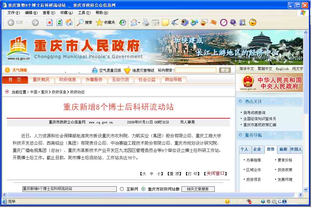 根据重庆市人民政府网报道,经专家评议,国家人力资源和社会保障部(人社部发[2008]43号)于2008年6月19日批准我校科技开发总公司等345个单位设立企业博士后科研工作站,开展废油资源化技术、环保及相关学科领域等的博士后培养工作。