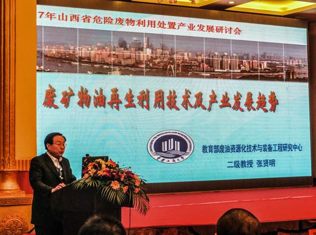 会议针对山西省长期以来作为能源重化工基地,危险废物产量大、种类多,但危废利用处置产业却起步晚、发展慢、水平低的现状,邀请国内同行专家进行新技术研讨、培训,以提高环境风险防控水平的同时,促进危险废物产业健康发展。我校教育部废油中心主任张贤明教授,被特邀在大会上做了“废矿物油再生利用技术及产业发展趋势”的学术报告。精彩的报告受到参会人员的高度关注,感到耳目一新,会后持续不断接受咨询,直到晚上已经休息还有企业人员上门,希望我校成果更多服务企业技术进步。