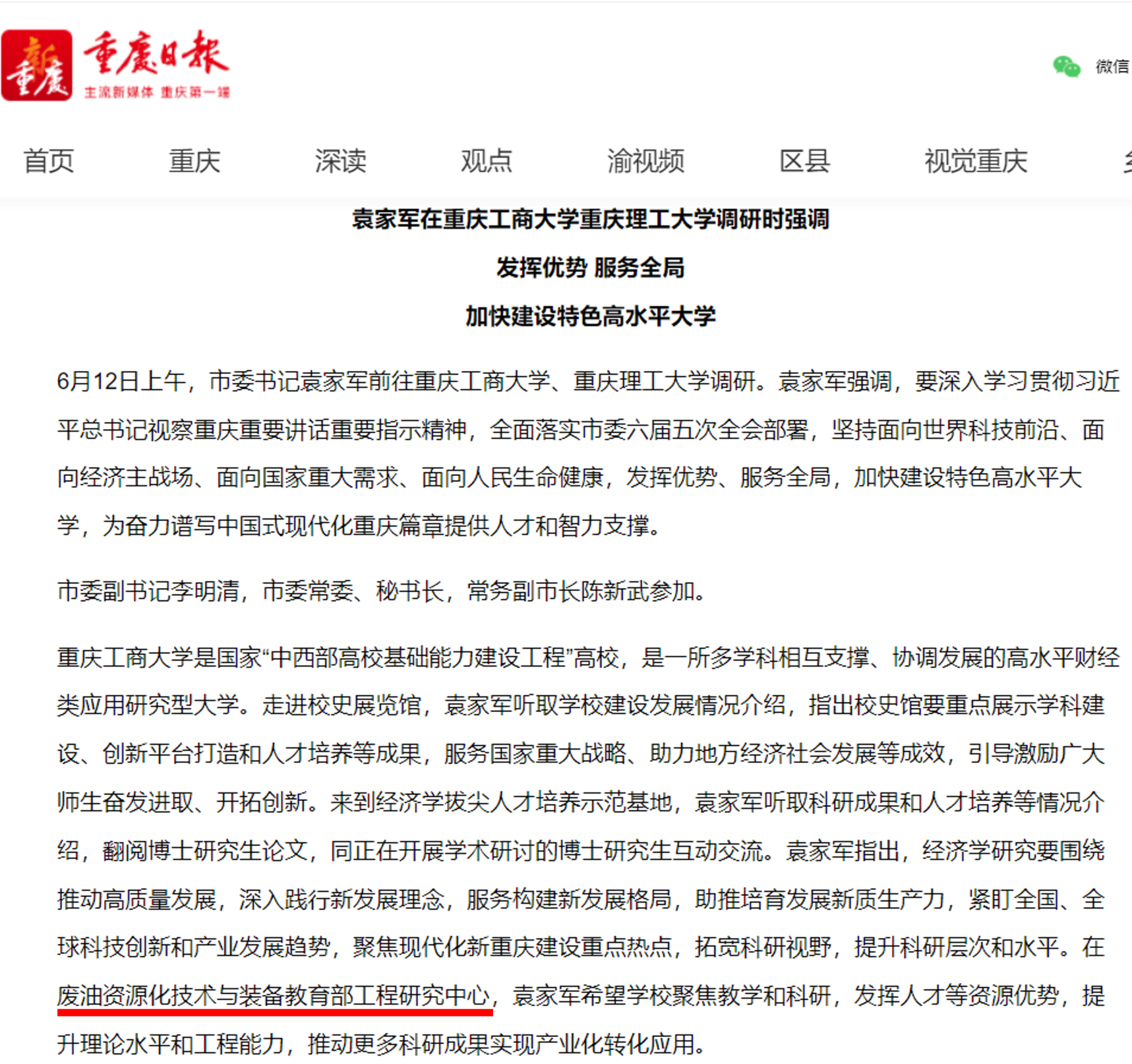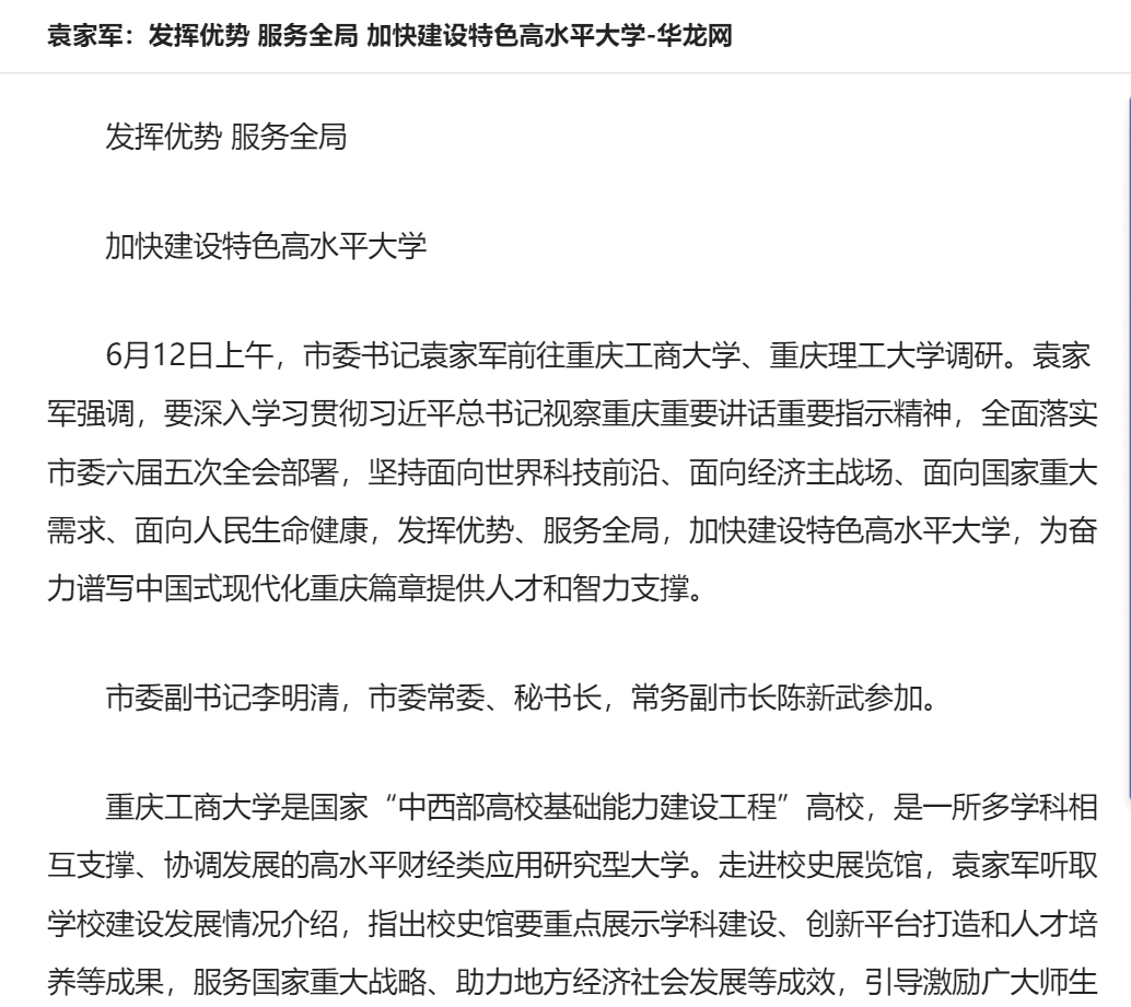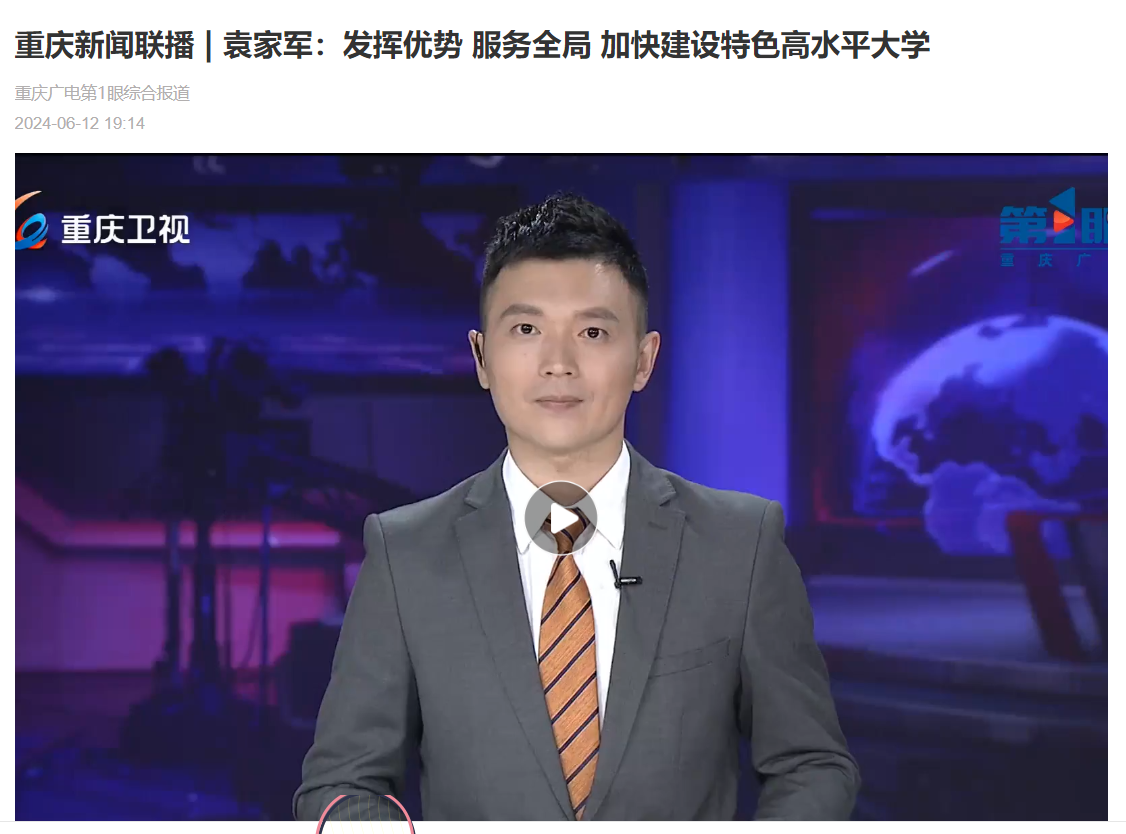 6月12日上午,市委书记袁家军前往我校调研。袁家军强调,要深入学习贯彻习近平总书记视察重庆重要讲话重要指示精神,全面落实市委六届五次全会部署,坚持面向世界科技前沿、面向经济主战场、面向国家重大需求、面向人民生命健康,发挥优势、服务全局,加快建设特色高水平大学,为奋力谱写中国式现代化重庆篇章提供人才和智力支撑。重庆新闻联播、《重庆日报》和华龙网对此进行了报道。