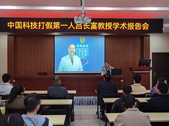2021年12月22日,我校客座教授,原重庆市质监局副局长,被中央电视台誉为中国科技打假第一人,近百次在央视10多个栏目宣传科技打假知识的吕长富教授,应邀在我校废油中心就真假红葡萄酒、白酒、真假电缆电线、化妆品、机械轴承等做了系列报告,吸引了百多名师生参加学术报告会。