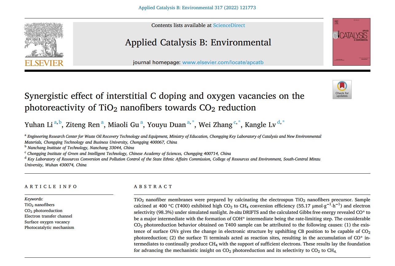 近日,我校废油资源化技术与装备教育部工程研究中心李宇涵副研究员在针对废油资源化过程中所产生温室气体CO2的光催化捕集转化方面取得了重要进展,成果题为“Synergistic effect of interstitial C doping and oxygen vacancies on the photoreactivity of TiO2 nanofibers towards CO2 reduction”在环境催化领域国际顶级学术期刊《Applied Catalysis B: Environmental》上发表(https://doi.org/10.1016/j.apcatb.2022.121773),也标志着在“双碳”背景下废油中心对废油污染防治和碳捕集利用方向的研究进入了新阶段。