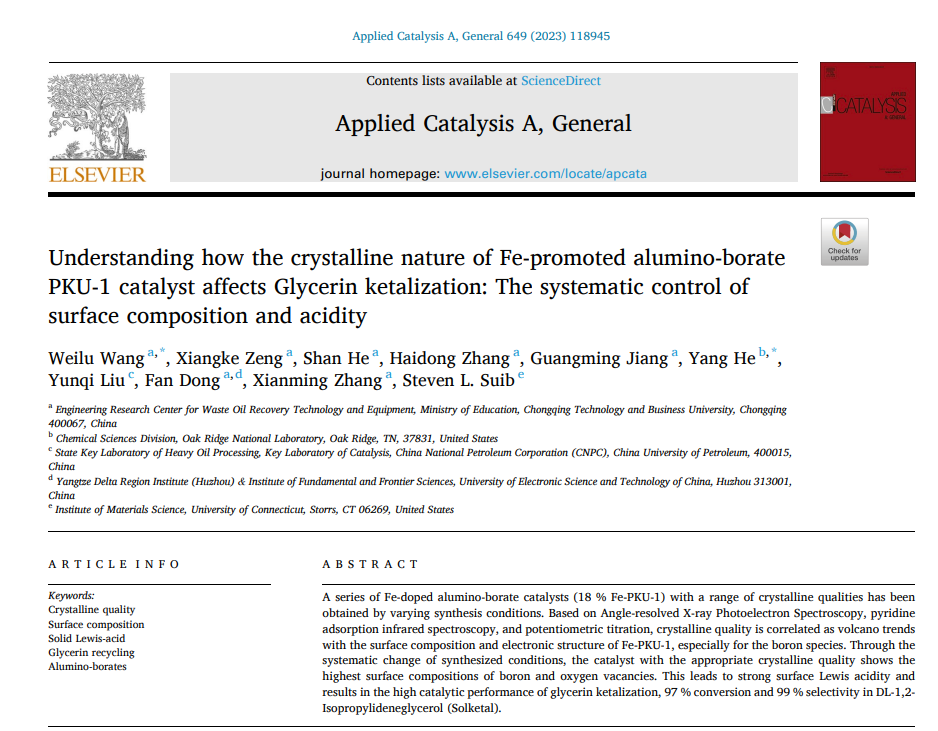 近日,我校废油资源化技术与装备教育部工程研究中心王玮璐博士,联合中心张海东研究员、蒋光明研究员、张贤明教授、中国石油大学(华东)柳云骐教授、美国橡树岭国家实验室何洋博士及康涅狄格州州立大学Steven L. Suib教授在工业催化领域知名期刊《Applied Catalysis A, General》发表题为“Understanding how the crystalline nature of Fe-promoted alumino-borate PKU-1 catalyst affects Glycerin ketalization: The systematic control of surface composition and acidity”学术论文(https://doi.org/10.1016/j.apcata.2022.118945),标志着中心在废生物柴油资源化领域的研究取得了新进展。