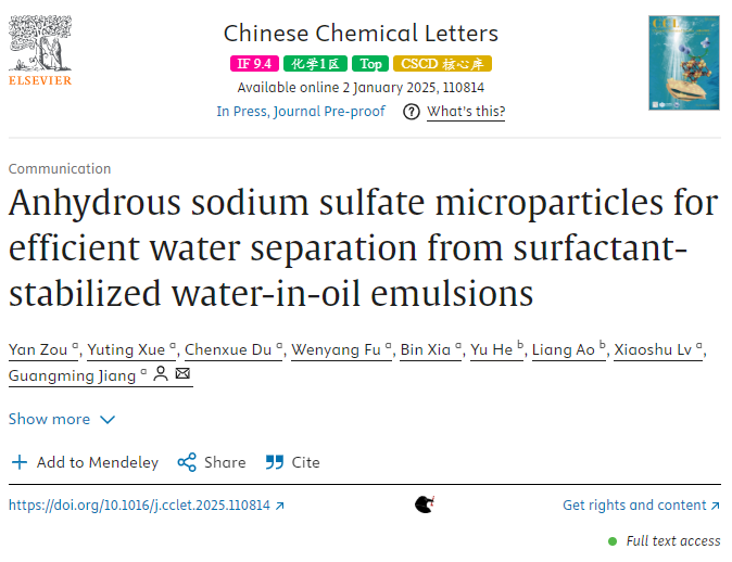 近日,我校废油资源化技术与装备教育部工程研究中心邹衍博士,在润滑油深度净化脱除微量水分领域取得重要突破。在《Chinese Chemical Letters》上发表了题为“Anhydrous sodium sulfate microparticles for efficient water separation from surfactant-stabilized water-in-oil emulsions” (https://doi.org/10.1016/j.cclet.2025.110814)的研究成果,该成果标志着废油中心在润滑油水分深度净化方面的研究更进一步。